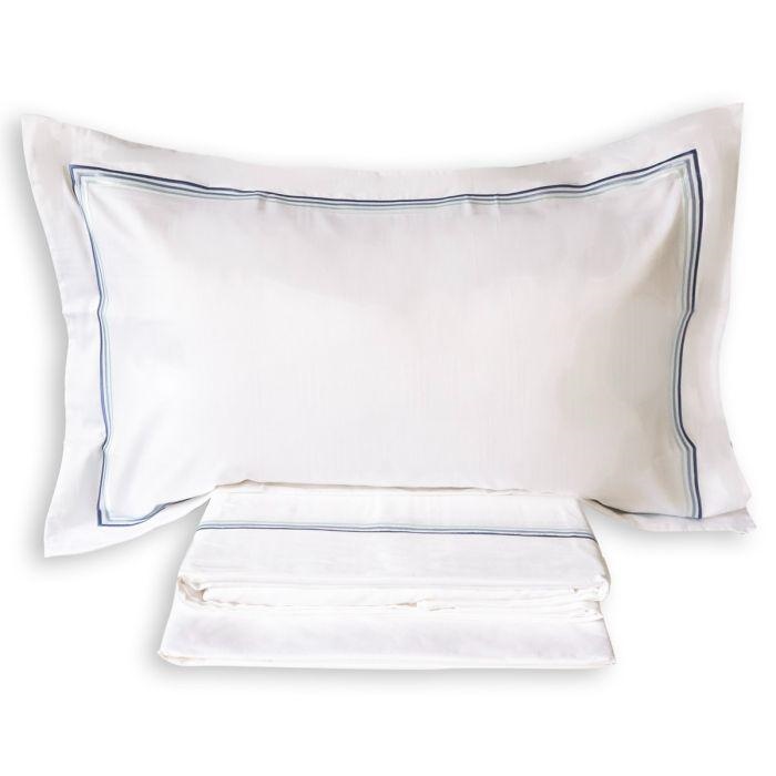 • 1 Lenzuolo sopra con raffinato triplo piping in gradazione di colore, impreziosito da cucitura a zig zag che valorizza i dettagli sartoriali.