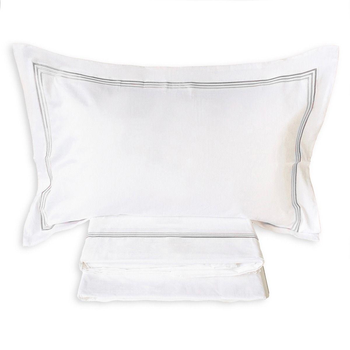 • 1 Lenzuolo sopra con raffinato triplo piping in gradazione di colore, impreziosito da cucitura a zig zag che valorizza i dettagli sartoriali.