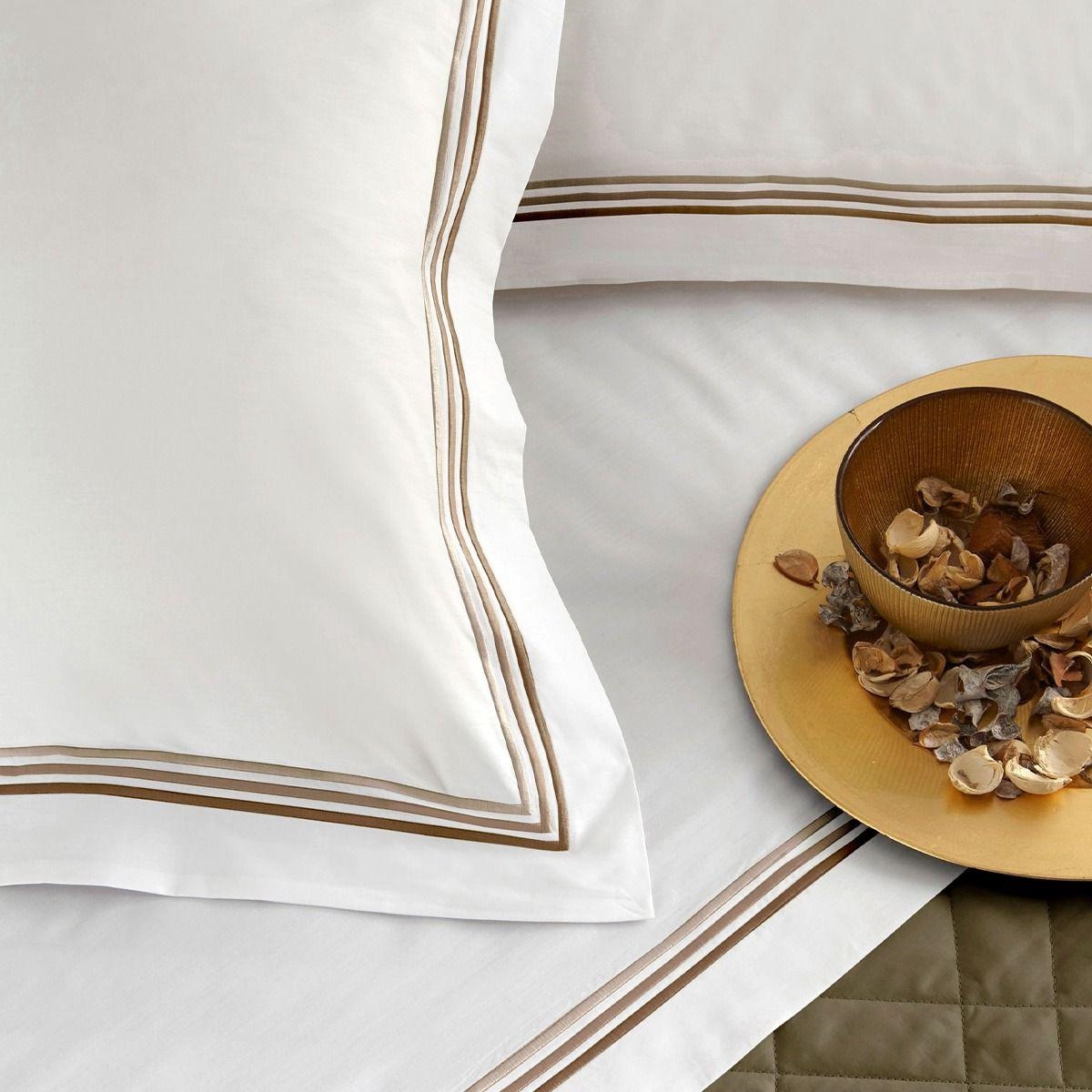 • 1 Lenzuolo sopra con raffinato triplo piping in gradazione di colore, impreziosito da cucitura a zig zag che valorizza i dettagli sartoriali.
