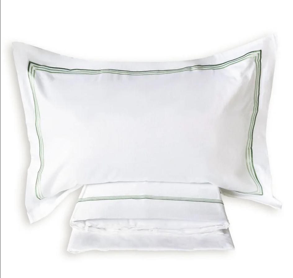1 Lenzuolo sopra con raffinato triplo piping in gradazione di colore, impreziosito da cucitura a zig zag che valorizza i dettagli sartoriali.